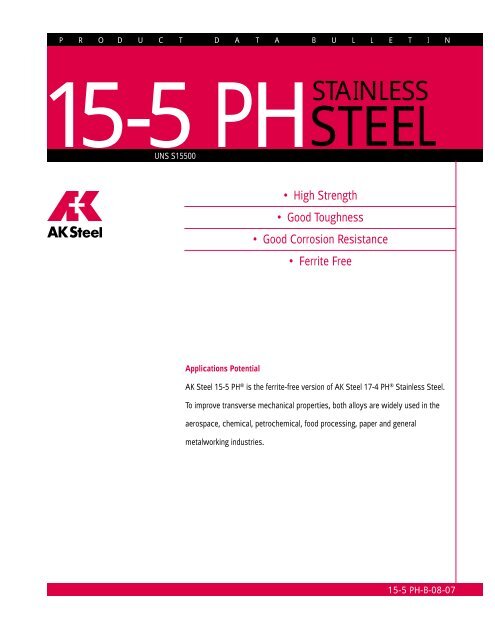 Ak steel 15 5 ph stainless steel offers a combination of high strength and hardness good corrosion resistance plus excellent transverse mechanical properties.
